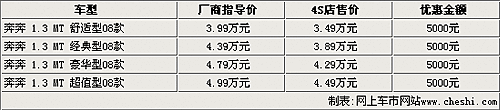 據(jù)銷售人員介紹,奔奔08款目前現(xiàn)車比較齊全,而且優(yōu)惠幅度比前一段時(shí)間也有了提高。原來(lái)購(gòu)買奔奔08款只能贈(zèng)送購(gòu)置稅,隨著銷售壓力及市場(chǎng)競(jìng)爭(zhēng)的不斷提高,目前奔奔08款最高可以優(yōu)惠五千元。