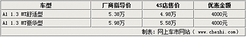 據(jù)銷售人員介紹,奇瑞A1目前可以優(yōu)惠4000元,但豪華型現(xiàn)車不足,部分顏色需要預(yù)訂。而且個(gè)別4S店的并沒(méi)有豪華型現(xiàn)車,也需要預(yù)訂,訂金為2000元。