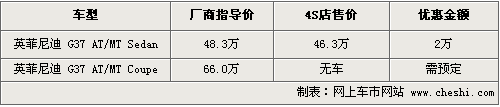 目前銷售的英菲尼迪G37只有四門版車型在售,廠商指導價格為48.3萬元,現在購車可以優惠現金2萬元,優惠后售價為46.3萬元,店內有銀色等款現車供應,同時兩門版車型尚沒有現車,需要預訂,訂金為1萬元。