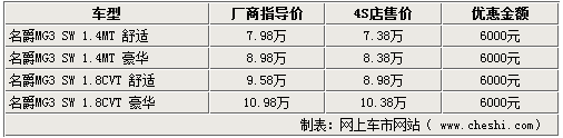 時值銷售旺季,各廠商紛紛拿出看家本領提高銷量。網上車市網站由經銷商處了解到,現在到店購買MG3 SW系列車型僅優惠6000元,相比前一段時間的萬元優惠有大幅度的縮水。具體詳情如下: