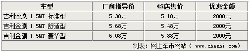 據(jù)北京地區(qū)吉利4S店銷售人員表示,吉利金鷹目前只有1.5手動標準型有現(xiàn)車銷售,自動版車型則沒有現(xiàn)車,暫不接受預(yù)訂,現(xiàn)在購買吉利金鷹手動版車型,全系都可以優(yōu)惠3000元,在享受國家政策優(yōu)惠的基礎(chǔ)上更加具有吸引力。而全新的替代車型將屬于吉利的全球鷹品牌之下,車型代號為GC515,有望在明年年初推出。