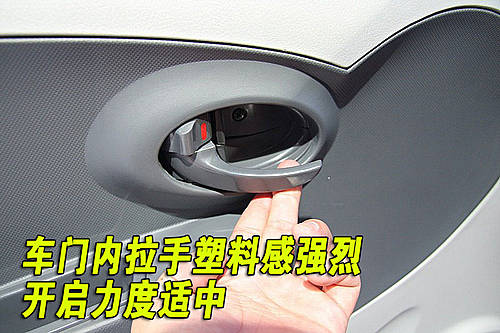 天津一汽威姿V1四只車門拉手都噴上了與車身同色的車漆,開啟車門時發現車門拉手部分做工比較細致,但有松垮感覺。