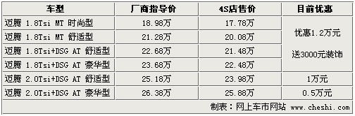 據4S店銷售人員介紹:目前邁騰最高優惠1.2萬元,店內購車還可送3000元裝飾,裝飾包括地膠、腳墊、汽車防爆膜等。目前邁騰現車充足,1.8Tsi車型銷量較好,所以車源較為豐富,但2.0Tsi豪華型無現車需預定,預定需等20天左右。由于2.0Tsi兩款車型銷量較少,所以優惠幅度較少,如果您對動力性要求不是非常高的話,1.8Tsi車型可以滿足您的需求,建議購買。