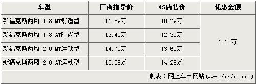 據(jù)長(zhǎng)安福特經(jīng)銷商處銷售人員介紹,目前購(gòu)買兩廂?怂沟南M(fèi)者可以得到1.1萬(wàn)元的優(yōu)惠。兩廂新款?怂狗譃1.8L和2.0L兩種排量,入門級(jí)車型的1.8L手動(dòng)舒適版經(jīng)優(yōu)惠后售價(jià)下降到了10.79萬(wàn)元。而高配的2.0L自動(dòng)運(yùn)動(dòng)版售價(jià)同樣也降到了14.29萬(wàn)元。