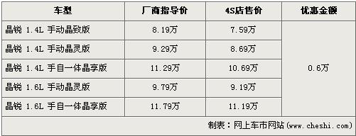 據(jù)4S店銷售人員介紹:目前晶銳全系優(yōu)惠6000元,最低僅售7.59萬。晶銳目前現(xiàn)車較為充足,顏色較齊全,只是個別車型無現(xiàn)車,顏色不齊全。如需要預(yù)訂車輛,最短需等2周時間,最長需等一個半月。