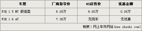 據比亞迪汽車北京地區4S店銷售人員介紹,目前北京在售的比亞迪F3R只有1.5L手動舒適版車型,并且廠商指導價也從6.08萬元回升到了6.28萬元。目前購買此車的消費者可以得到2800元的優惠,經優惠后售價降到了6萬元。