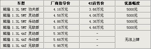 據(jù)吉利汽車4S店銷售人員介紹,熊貓1.3L手動擋車型目前都有現(xiàn)車銷售,而自動擋雖然已經(jīng)上市,但由于北京地區(qū)無法上牌,所以還沒有現(xiàn)車抵達北京市場,預計最早會在今年8月份解決無法上牌的問題。目前熊貓1.3L手動擋全系可以優(yōu)惠五千元,而這款車型還增加了電動升級后窗,需要在原價的基礎(chǔ)上加1000元。