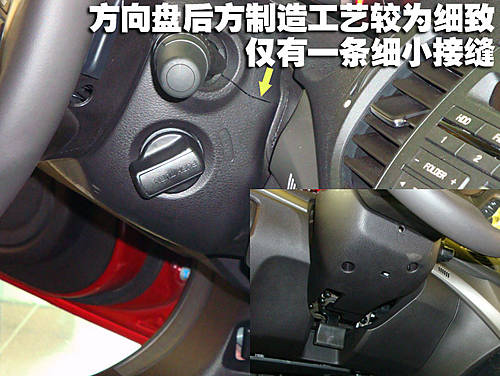 在上面的圖片我們可以非常明顯的看到:在轉向柱和鑰匙孔周圍等處的模具工藝比較高,且接縫均勻,整體感較強。思鉑睿的油門和剎車踏板均為橡膠包裹,踏板面積較大,力度適中。并且剎車踏板行程較短,并且很靈敏。
