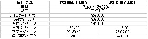 貸款詳解:飛度是小型家用車的典范,這點從它的銷量上就能看出來。缺點么,可能就是大家比較關心的安全和價錢問題。總體來說,飛度綜合素質較高,是第一臺車的好選擇。該車首付需2萬余元,月供僅需1400余元,對于手頭緊張的消費者來說還是比較劃算的。