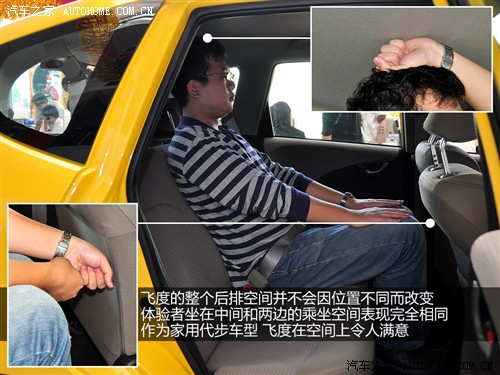 但飛度的后排腿部空間達到了兩拳,這是十分出色的表現。不過我們也注意到,飛度之所以能有寬裕的腿部空間,和其較單薄的前排座椅設計不無關系。最后值得肯定的是,飛度的后排地板比較平坦,中間乘客的腳可以在不妨礙旁人的前提下放在舒適的位置上。