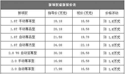 上海大眾PASSAT新領馭的外形大氣,在國內公務車市場中銷量名列前茅,在很多國人眼中新領馭是公務車的首選車型。進入10月份之后,北京地區綜合經銷商處新領馭的優惠再次增加,目前新領馭全系車型的降幅均在1.4-1.9萬元區間,其中新領馭最低配車型的售價為15.58萬元,比9月份下降了6000元,性價比再次提升。以下是新領馭全系車型最新詳細報價表: