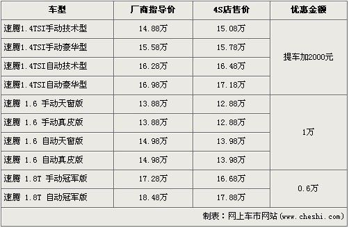 據(jù)一汽大眾4S店銷售人員介紹,速騰最新上市的1.4TSI車型已經(jīng)到了少量現(xiàn)車,并且現(xiàn)在提現(xiàn)車的消費者需要在原廠指導(dǎo)價的基礎(chǔ)上加價2000元才可提車。目前在售的速騰分為1.4TSI、1.6以及1.8T三種排量車型,購買1.6L車型的消費者可以享受到全系最高的1萬元優(yōu)惠,1.8T冠軍版有6000元的現(xiàn)金優(yōu)惠。