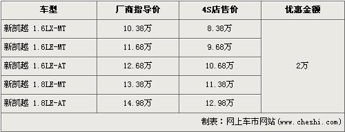據4S店銷售人員介紹,新凱越分為1.6L與1.8L兩種排量車型,目前新凱越全系優惠2萬元,較上個月的優惠降幅有所下降。經優惠后,全系最低配的1.6LX-MT車型售價下降到了8.38萬元。經優惠后,1.8L手動和自動兩款車型售價也下降到了11.38萬元和12.98萬元。銷售人員還介紹,目前店內現車齊全,是消費者挑選的較好時機。