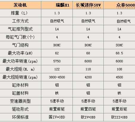 安全配置方面:在三車的半數或大部分車型上,都配備有ABS+EBD,雙安全氣囊之在瑞麟X1和長城迷你上找到,眾泰5008全系沒有這個被動安全配置。很顯然,瑞麟X1發揮了后來車型的優勢,中高配車型竟然還有前排側氣囊,以及和長城迷你SUV一樣的安全帶未系提醒。另外X1還引入了倒車雷達,這是其他兩車所沒有的。