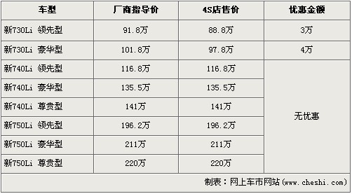 據(jù)北京寶馬經(jīng)銷店銷售人員介紹,寶馬新7系共分為730Li、740Li、750Li三種等級車型,售價(jià)區(qū)間為91.8萬元-220萬元。目前購買新730Li領(lǐng)先型的消費(fèi)者可以得到3萬元的優(yōu)惠,新730Li豪華版車型可以優(yōu)惠4萬元。消費(fèi)者還介紹,除了新730Li有現(xiàn)車外,其余車型均需預(yù)訂,訂金是10萬元,最早12月份可提車。