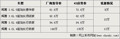 據北京進口大眾經銷店銷售人員介紹,目前輝騰3.6L 5座加長豪華版有9萬元的現金優惠,經優惠后3.6L 5座加長豪華版的售價降到了72.8萬元。排量稍大的4.2L 4座加長行政版有13萬元的優惠,經優惠后售價從148萬元下降到了135萬元。銷售人員還介紹,4.2L輝騰沒有現車,欲購買的消費者需交訂金10萬元預訂。