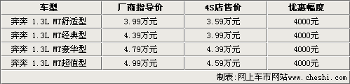 據長安轎車4S店銷售人員介紹,奔奔目前現車都比較齊全,但與上月相比,優惠幅度明顯有所減少。目前奔奔1.3L四款車型只能優惠4000元,比前一段時間少了1000元。但銷售人員也表示,如果消費者到店詳談,還可能有進一步優惠的余地。