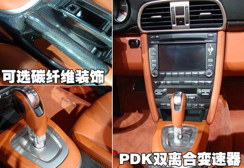 2010款保時捷911 Turbo敞篷版三輻方向盤兩側則依照人體工學設計,分別加入音響通訊的控制鍵與滾輪,外側則是鋁合金的PDK換檔滑動開關,這項全新的方向盤換檔設計,在人體工學的表現相當優異,利用食指或中指就能完成升檔與降檔的檔位變換動作。