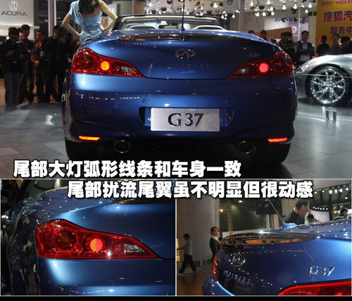 G37敞篷版的尾部大燈設(shè)計(jì)與前大燈交相呼應(yīng),同時(shí)尾部的小型擾流尾翼也為尾部增添了動(dòng)感色彩。車(chē)身簡(jiǎn)潔的線條個(gè)性很鮮明,流暢中蘊(yùn)含著無(wú)限動(dòng)能與速度感,讓人過(guò)目難忘。