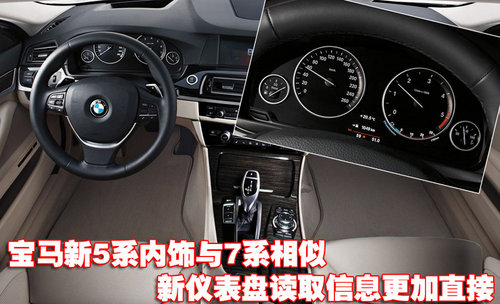 寶馬新5系的內飾與7系有些相似,新款儀表盤讓駕駛員讀取信息更加直接。而第四代寶馬iDrive系統和6速電子手自一體變速箱,也均成為寶馬新5系的標準配置。