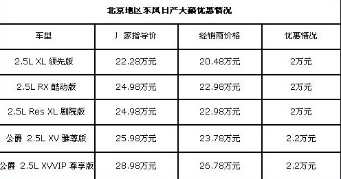 近日,筆者從東風日產北京經銷店了解到,新天籟2.5車型最高將優惠2.2萬,并且4S店有現車,提車速度較快,這對那些準備出手新天籟的北京朋友的確是一個好消息。
