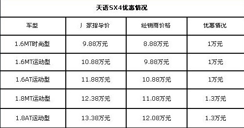 同時(shí),天語(yǔ)SX4兩廂車(chē)型顏色齊全,并且現(xiàn)車(chē)較為充足,天語(yǔ)SX4三廂與兩廂車(chē)型的優(yōu)惠幅度一樣,但部分現(xiàn)車(chē)顏色不全,可預(yù)訂購(gòu)買(mǎi),訂金3000元。