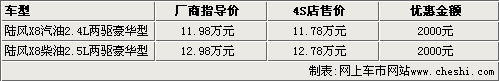 據陸風汽車4S店銷售人員介紹,目前陸風X8汽油版兩驅豪華型已經有試駕車到店,消費者對這款車感興趣可以到店試駕。雖然目前還沒有現車銷售,但陸風X8目前已經接受預訂,訂金為2000元,現在購車全系現金可優惠2000元。