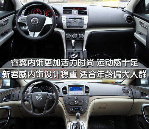 馬自達睿翼中控臺整體設計簡潔,黑色內飾配以中控臺銀色裝飾條的點綴,突出運動氣息,多功能方向盤可使駕駛者在行車中操作更加便利與安全。新君威內飾突出豪華與安逸,更適合年齡偏大人群,中控臺上方大屏幕可以清晰顯示車輛狀態,讀取更加方便。