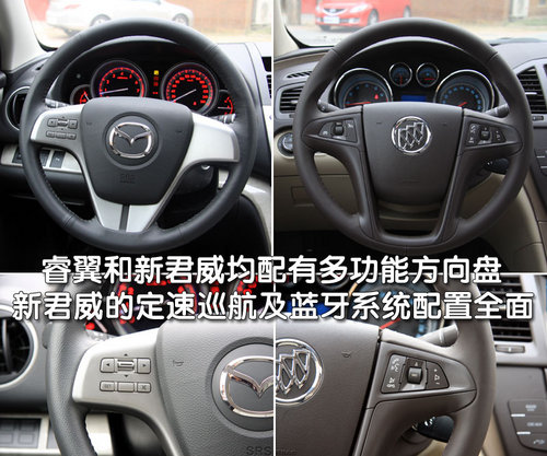 睿翼與新君威均配備了多功能方向盤,但在功能上有所差異,睿翼2.0豪華版只集成了音響控制系統,而新君威2.0精英版集成了音響、定速巡航及藍牙電話系統,新君威在人性化配置上更加全面。