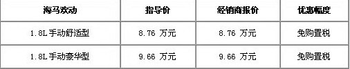 隨著年末的臨近,明年的購置稅新政成為城中話題。近日新政策公布,明年優(yōu)惠收縮至75折,讓不少觀望的朋友緊張起來。車天下編輯從昆明合達獲悉,為滿足消費者年底購車的迫切希望,現(xiàn)推出海馬歡動1.8L全系車型免購置稅活動。具體車型及詳細優(yōu)惠政策,如下表: