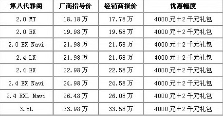新雅閣,自誕生之日起就打著“史上最強雅閣”的旗號,10月更是一舉奪得昆明中級車上牌量亞軍,其實力不容小覷。近日,車天下編輯從廣本梁源店獲悉,自2009年12月14日至12月31日購置雅閣車型即可享受4000元歲末現(xiàn)金優(yōu)惠以及2000元店慶購車禮包。具體車型及詳細優(yōu)惠政策,如下表: