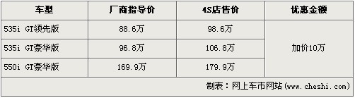 據北京寶馬4S店銷售人員介紹,目前店內可以接受寶馬5系GT的預訂工作,訂金為10萬元,首批預訂寶馬5系GT550i的消費者將會在本月月底提到現車,其他車型需等到3月份才可提車。銷售人員還介紹,寶馬5系GT全系售價目前會在原廠商指導價的基礎上加價10萬元,加價后售價分別漲為了98.6萬、106.8萬和179.9萬。