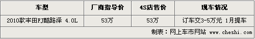 據4S店銷售人員介紹,目前2010款Fj酷路澤已經有部分黑色展車到店。全系車型共有寶石綠、炫金黃、漢玉白、鈦白銀、瑪瑙紅、琥珀金、紫鉆黑7款顏色可供選擇。現在訂車的話最快1月份可到車,如果訂購漢玉白、鈦白銀這樣較為少見的顏色則需2月份左右才能提車。目前訂金為3萬元-5萬不等。