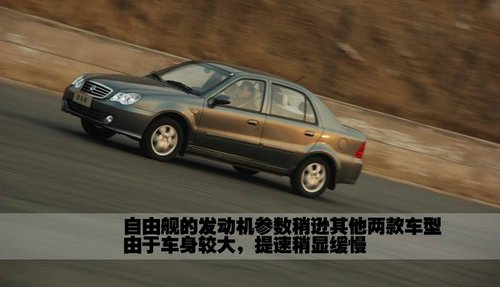 自由艦發(fā)動機的參數(shù)指標明顯不如夏利N5和新羚羊,最大扭矩輸出為5200轉(zhuǎn),低速扭矩的表現(xiàn)不盡人意。另外,自由艦車身大于其他兩款車型,靜止提速和運動中提速都略遜于其他兩款車型。