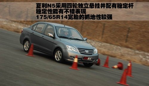 這項測試也可稱之為“麋鹿測試”,可以檢驗車輛回避障礙的能力。對于我們進行測試的車輛來說,60km/h的通過速度基本已經達到極限。夏利N5采用四輪獨立懸掛,能夠提供有效的后段支撐力,并且配備了穩定桿,能夠使車輛保持在穩定的行駛路線。另外,夏利N5配備175/65R14的寬胎,緊急并線時表現的抓地力也非常不錯。