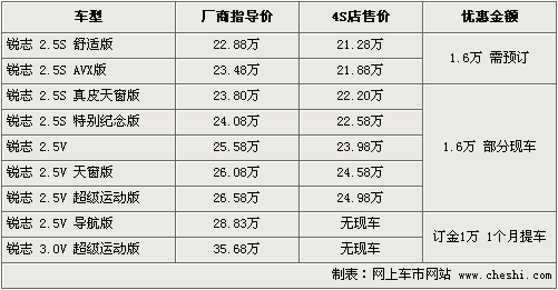 據一汽豐田4S店銷售人員介紹,目前銳志可優惠1.6萬元,現車比較齊全,一般購買車型主要集中在舒適版和紀念版,消費者可根據需要選購。另據介紹,新銳志車型要在明年4月北京車展亮相,之后2個月左右才可以購買到,并且新款車型剛上市不會有現款這么大的優惠空間,目前購買現款銳志也是一個不錯的選擇。如消費者有意購買,到店詳談會有更優惠的價格。北京地區各4S店由于訂單不同,各店銷售的現車顏色有所不同。