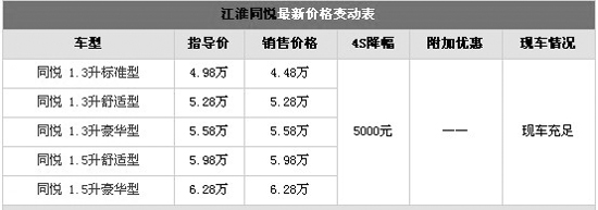江淮同悅有1.3L和1.5L兩種排量,全為手動檔車型。分標(biāo)準(zhǔn)型、舒適型和豪華型三種配置。標(biāo)準(zhǔn)型無安全氣囊,配備有ABS制動防抱死系統(tǒng),四門車窗和電調(diào)后視鏡;舒適型增添了駕駛座安全氣囊、倒車?yán)走_(dá)、遙控鑰匙和中控;豪華型相對于舒適型升級了副駕安全氣囊和前霧燈安全配置,配備了單碟CD機(jī)并升級了音響系統(tǒng),增加了后視鏡加熱功能和鋁合金輪轂。