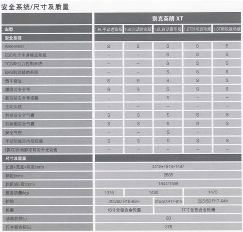 別克英朗提供了較多的車輛電子安全系統,包括:ABS、EBD、CBC、EDC,最新版本的ESC系統和大尺寸剎車碟。前排4只安全氣囊在同級別車型的配備中算得上是中規中矩,沒有側面頭部安全氣簾也許是英朗整車上為數不多的因成為而妥協的安全配置。