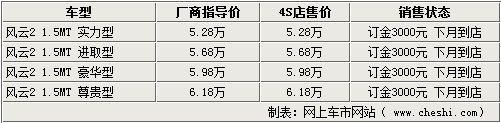 奇瑞經銷商表示,現在店內的風云2新車不全,消費者購車需要繳納3000元訂金并等待半個月才可提車。由于是全新的車型,所以現階段購車暫時沒有任何形式上的優惠。