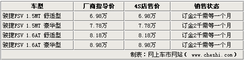 經(jīng)銷(xiāo)商透露,現(xiàn)在各店內(nèi)的FSV基本為展車(chē)或已被客戶(hù)預(yù)訂的車(chē)輛,基本沒(méi)有現(xiàn)車(chē)可以滿(mǎn)足消費(fèi)者的需要,消費(fèi)者如需購(gòu)買(mǎi)可以繳納2千元訂金后等待一個(gè)月左右即可提車(chē)。由于駿捷FSV現(xiàn)階段現(xiàn)車(chē)不足,所以店內(nèi)沒(méi)有任何形式的優(yōu)惠,請(qǐng)消費(fèi)者諒解。