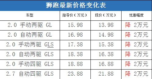 近日,編輯從北京地區(qū)綜合經(jīng)銷(xiāo)商處了解到,獅跑全系的現(xiàn)車(chē)充足,基本上可以滿足消費(fèi)者在春節(jié)期間的需求;目前購(gòu)車(chē)全系可以?xún)?yōu)惠2萬(wàn)元現(xiàn)金,性?xún)r(jià)比很不錯(cuò)。據(jù)經(jīng)銷(xiāo)商透露,消費(fèi)者要想以這個(gè)價(jià)格提車(chē),需要在店內(nèi)做購(gòu)車(chē)一條龍服務(wù),其中車(chē)輛四項(xiàng)基本保險(xiǎn)可以打8.5折(約合4500-6300元左右)。以下是獅跑最新價(jià)格變化表: