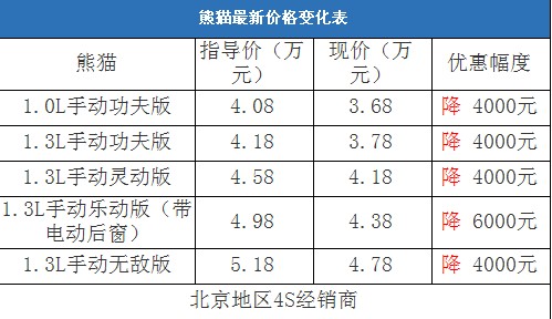 近日,編輯從北京地區(qū)吉利4S經(jīng)銷商處了解到,熊貓有少量現(xiàn)車在店內(nèi)銷售,全系可以優(yōu)惠4000元現(xiàn)金,并贈(zèng)送腳墊、貼膜等基本裝飾。其中店內(nèi)有一臺1.3L手動(dòng)樂動(dòng)版特價(jià)車(紅色),因?yàn)槭?9年生產(chǎn)的,可以優(yōu)惠6000元現(xiàn)金,性價(jià)比還不錯(cuò),消費(fèi)者可以到店詳談爭取更多優(yōu)惠。以下是熊貓最新價(jià)格變化表: