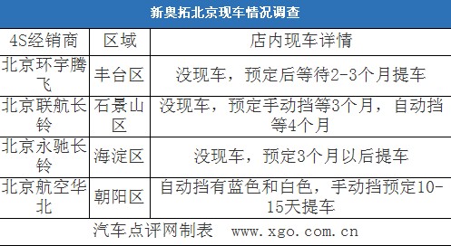 新奧拓僅有1.0L排量3款車型可選,其中賣的最好的應該是自動擋車型。北京地區長安鈴木的4S經銷商比較多,我們隨機選擇了4家經銷商,其中僅有位于朝陽區的北京航空華北店有自動擋現車,顏色有藍色和白色。手動擋車型沒有現車,如果預定的話,10-15天可提車。剩下的三家4S店內都沒有現車,預定的話,最快要等待2個月才能到店,最慢要等4個月才能到店。