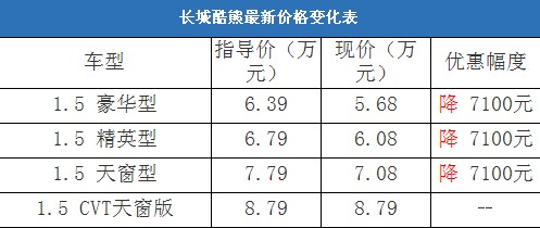近日,編輯從長城汽車4S經(jīng)銷商處了解到,酷熊前段時(shí)間購車送鉆石的促銷活動(dòng)已經(jīng)結(jié)束,目前在店內(nèi)購車沒有任何優(yōu)惠。相比之下,在綜合經(jīng)銷商處購車的消費(fèi)者可以享受7100元的現(xiàn)金優(yōu)惠。據(jù)經(jīng)銷商透露,酷熊的CVT版車型也可以預(yù)定,定金為2000元,等待15個(gè)工作日就可以提車,但是購車沒有任何優(yōu)惠。以下是長城酷熊最新價(jià)格變化表: