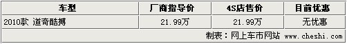 據(jù)道奇4S店銷售人員介紹:目前2010款道奇酷搏北京地區(qū)無現(xiàn)車,但部分4S店內(nèi)接受預(yù)訂,定金為5000元。據(jù)經(jīng)銷商介紹,2010款酷搏計劃將在第二季度引入中國,但最早可能在3月份到店銷售。2010款酷搏仍將搭載2.0升自然吸氣發(fā)動機,在配置上將與08款車型相差不多,相比09款車型配置更豐富;此款車型售價為21.99萬元,在價格方面與老款車型持平。