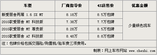 據(jù)東風(fēng)雪鐵龍4S店銷售人員介紹,目前愛麗舍全系車型均為包牌銷售,其中兩廂包牌價8.5萬元,三廂三款車型包牌價分別為7.7萬元,8.5萬元以及8.8萬元。包牌價分別包括了交強險,購置稅和驗車費。對消費者而言節(jié)省了不少的費用。現(xiàn)車方面只有極少量手動科技版現(xiàn)車,顏色以銀色為主。其它車型及顏色需要預(yù)定,訂金1千元,2周左右可以提到車。北京地區(qū)各4S店由于訂單不同,各店銷售的現(xiàn)車顏色有所不同。