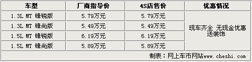 據長城汽車4S店銷售人員介紹,長城凌傲車型目前1.3L鋒銳版、1.3L鋒尚版、1.5手動鋒銳版和1.5手動鋒尚版有現車,顏色比較齊全。全系沒有任何優惠,顧客到店購車可以贈送裝飾。