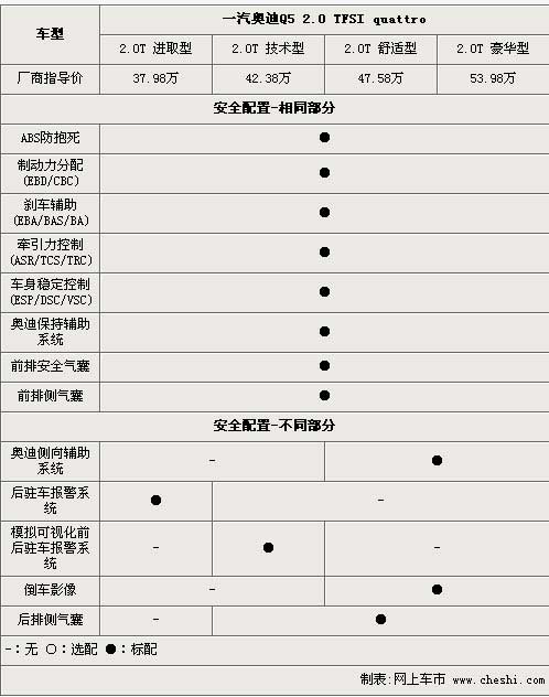 在主動安全與輔助安全性方面,ABS防抱死系統、制動力分配、剎車輔助、動態車身穩定系統等主動安全設備都被配備在了全系車型身上,奧迪保持輔助系統則可以在您偏離行駛軌道時,通過方向盤的震動向駕駛員提醒車輛脫離行駛車道。前排安全氣囊以及前排側氣囊兩項輔助安全配置也全系安裝上身,而在進取型上則取消了后排側安全氣囊。4款車型在駐車提示方面配置差異較大,進取型采用了傳統的雷達探頭報警系統,技術型采用的是模擬可視化前后駐車報警系統,而舒適型以及豪華型則安裝了更加直觀的倒車影像。