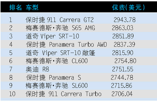 第一名跟第十名的保費差距大約也才只有240美金,而在前十名之后的11~20名中,基本上都是梅賽德斯·奔馳的天下,包括CL65 AMG、S600、SL65 AMG以及CL63 AMG都入選在內(nèi),除此之外,還有寶馬M6(硬頂及敞篷版)和760i以及兩款捷豹XKR機械增壓版本。不過,文章并沒有講明保險金額的實際保障內(nèi)容是什么,所以跟國內(nèi)的保費也不太好比較。可是,可以看出,榜單中的這些車輛售價也并不便宜,這點兒保費還真不算什么。(記者陳鑫欣)