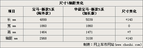 華晨寶馬新5系Li根據(jù)BMW新款5系轎車(chē)衍生而出,相比已經(jīng)在歐洲上市的新款5系轎車(chē)來(lái)說(shuō),針對(duì)中國(guó)市場(chǎng)的寶馬新5系Li轎車(chē)已經(jīng)被整整加長(zhǎng)了14厘米,這幾乎是一個(gè)成年人手掌寬度兩倍以上的距離。全部的軸距加長(zhǎng)都被設(shè)計(jì)在了車(chē)輛后門(mén)的位置也就是B柱之后,因此整車(chē)長(zhǎng)度也比歐洲市場(chǎng)的同款5系轎車(chē)要長(zhǎng)出14厘米。而在車(chē)身高度方面也許是為了適應(yīng)中國(guó)市場(chǎng)的路寬條件提升道路通過(guò)性,整車(chē)高度也被提升了7毫米。
